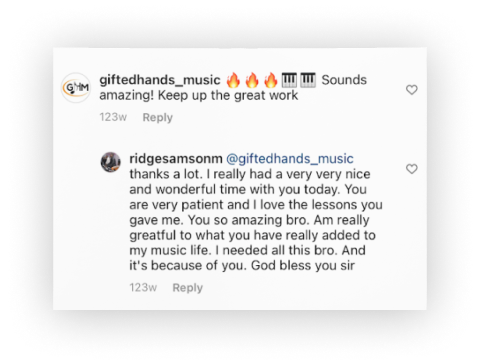 At Gifted Hands Music, we’re confident that your ability to play and understand gospel music will be radically improved in as little as 90 days. If for any reason you don’t believe the content covered has helped you improve as a musician, we guarantee to give you a full refund AND pay for your lessons with one of our competitors.